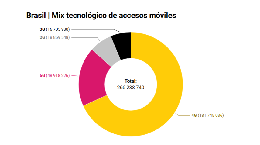 Con un crecimiento de 67% interanual, el número de accesos 5G se consolidó en Brasil y ahora representa 18.3% de los accesos a telefonía móvil. La tecnología 4G se mantiene como predominante (68.2%), seguido de 2G y 3G.