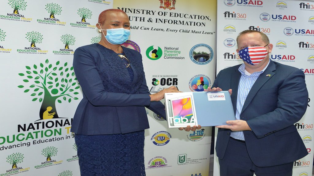 El martes (2 de febrero de 2021), el Encargado de Negocios de la Embajada de los Estados Unidos en Jamaica, John McIntyre, entregó formalmente 300 tabletas y 10 computadoras portátiles en las oficinas del ministerio, en Heroes Circle en Kingston.