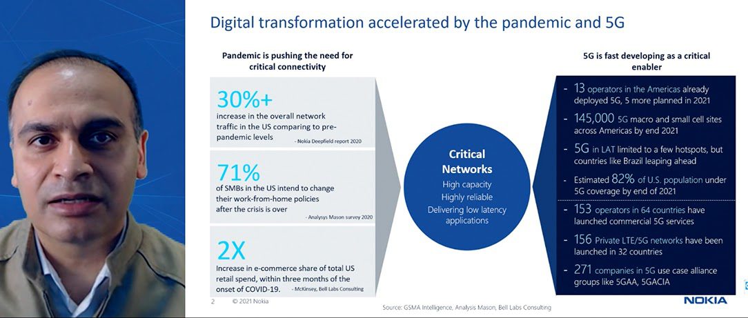 La pandemia aceleró la transformación digital en el mundo y la tecnología 5G potenciará la digitalización en el continente americano, señaló Nishant Batra, director de Estrategia y Tecnología de Nokia, en el foro virtual El auge de la digitalización en las Américas, organizado por la compañía finesa.