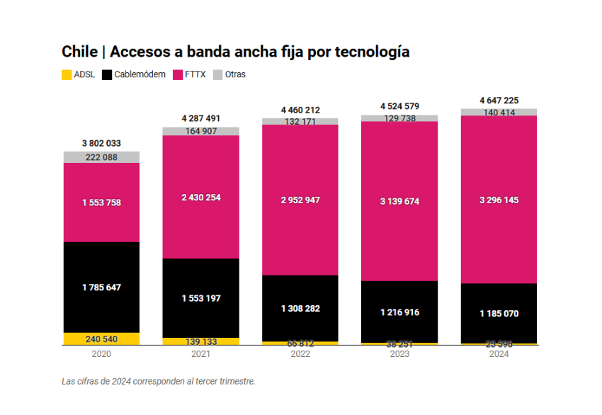 Se incrementó un 5.8 por ciento la base de abonados de banda ancha fija por fibra óptica en Chile. Hay 3.2 millones de clientes bajo esta tecnología, que representó el 70.9 por ciento de las suscripciones al tercer trimestre de 2024. La base general se incrementó un 3.1 por ciento hasta 4.6 millones.