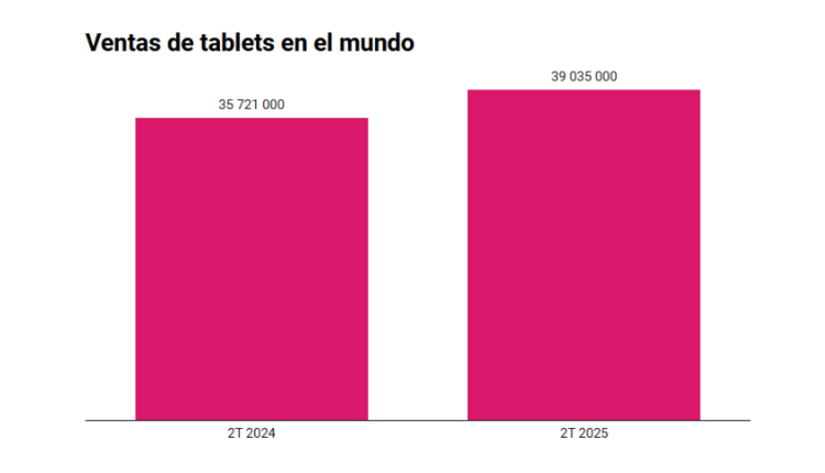 Se vendieron 39 millones de tablets en el mundo en el segundo trimestre de 2025, en lo que fue el sexto trimestre consecutivo en alza. En esta ocasión, el incremento fue de 9.3% interanual y fue impulsado por una sólida demanda en China y Europa, Oriente Medio y África (EMEA). La información fue provista por Canalys (Omdia).