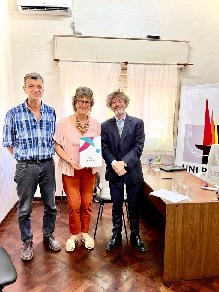 Luego de que Claudio Ambrosini rubricara su firma, el director propuesto por la Comisión Bicameral de Promoción y Seguimiento de la Comunicación Audiovisual, las Tecnologías de las Telecomunicaciones y la Digitalización, Alejandro Gigena, visitó la sede del Rectorado de la UNLPam, en General Pico, donde, junto con la vicerrectora a cargo del Rectorado de la Universidad, María Ema Martin, y el decano de la Facultad de Ingeniería, Daniel Mandrile, formalizó el acuerdo entre ENACOM y la UNLPAM.