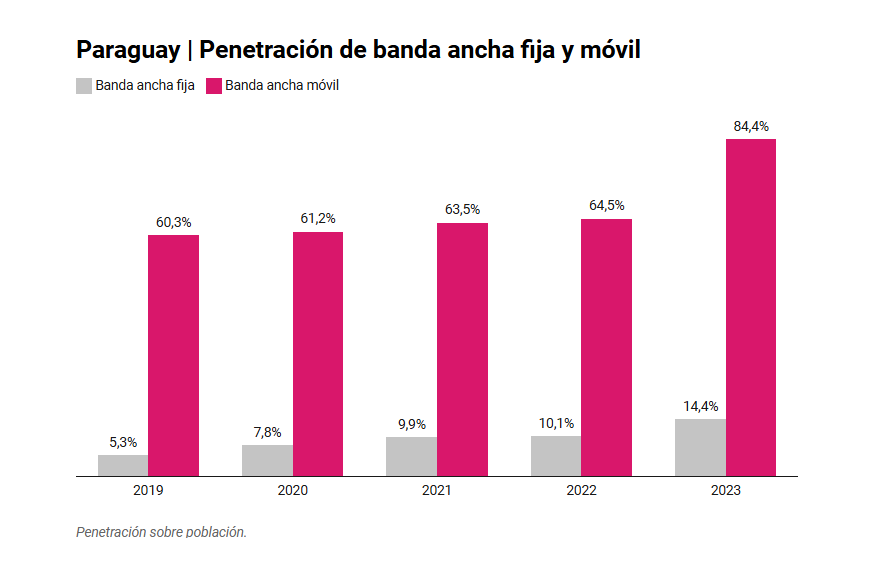 Crece la penetración de banda ancha en Paraguay. Los datos más recientes de la Comisión Nacional de Comunicaciones (Conatel) registran un aumento de casi 20 puntos porcentuales en los accesos de banda ancha móvil sobre población hasta 84.4 por ciento en 2023. En tanto, se incrementó de 10.1 a 14.4 por ciento la penetración de banda ancha fija; el regulador no precisó el número de accesos sobre hogares.