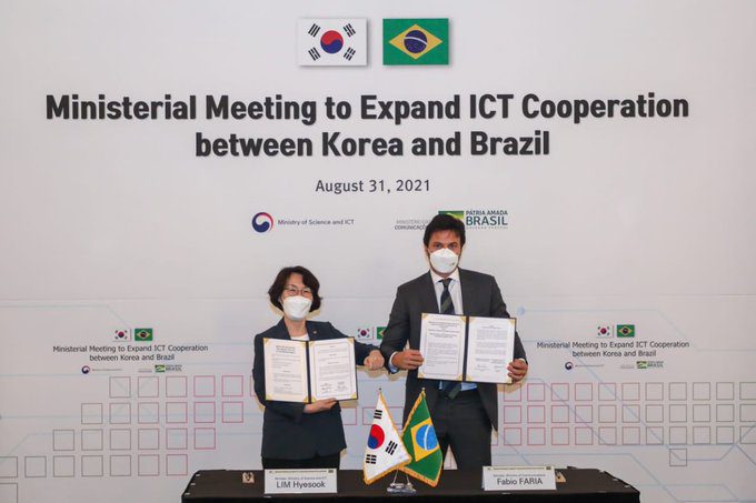 El Ministro de Comunicaciones de Brasil, Fábio Faria, firmó un acuerdo de cooperación con Lim Hye-Sook, ministra de Ciencia, Tecnología de la Información y Comunicación de Corea del Sur, esta semana.