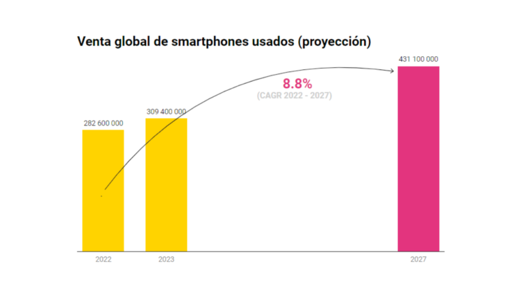 Se comercializaron 309.4 millones de smartphones usados en 2023, lo que significa un aumento de 9.5 por ciento interanual. Un nuevo informe de IDC estima que el envío de este tipo de dispositivos alcanzarán 431.1 millones de unidades en 2027, con una tasa de crecimiento anual compuesto (CAGR) de 8.8 por ciento.