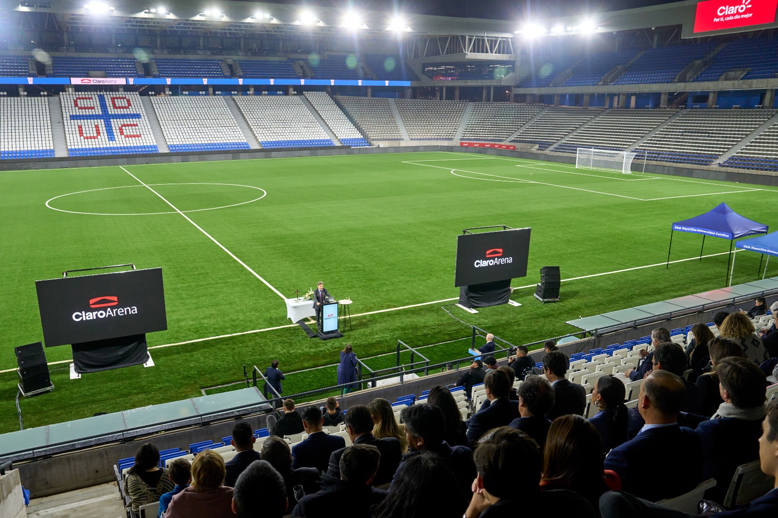 “Claro Arena es el esfuerzo de muchos que hoy son parte de esta ceremonia, y con conceptos muy firmes como modernidad, multiservicio, sustentabilidad y conectividad nos aprontamos a vivir un nuevo concepto junto a Claro para ofrecer una experiencia inédita en el deporte y la entretención”, valoró Juan Tagle, presidente de Cruzados.
