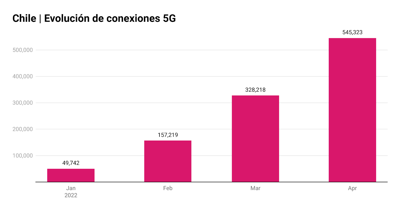 Chile tiene 545 mil 323 conexiones 5G a abril de 2022, cuatro meses después del encendido oficial de la tecnología. Las cifras surgen de un nuevo informe de la Subsecretaría de Telecomunicaciones (Subtel), que agregó que alcanzar ese número de abonados le llevó 12 meses a 4G, tecnología que redujo su base en la última medición. 5G es ofrecido, al momento, por tres prestadores en el ámbito local: Movistar, Entel y WOM.