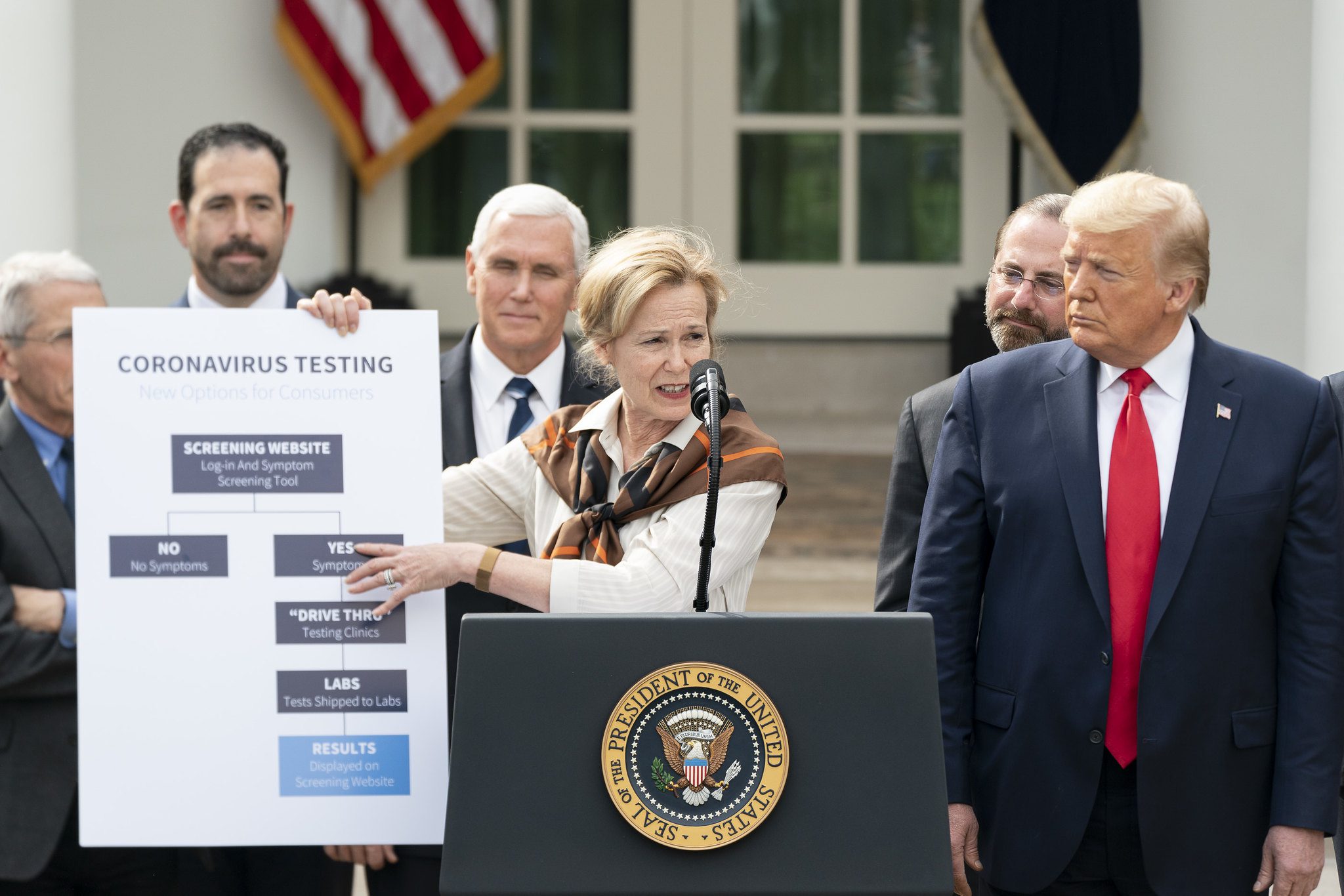 Durante la rueda de prensa, Debbie Birx, coordinadora de respuesta al coronavirus de la Casa Blanca, mostró un diagrama de cómo funcionaría en teoría esta web. Los ciudadanos podrán introducir los síntomas que sufran, sus relaciones con grupos de riesgo en los últimos días y recibir asesoramiento sobre si necesitan pruebas adicionales.
