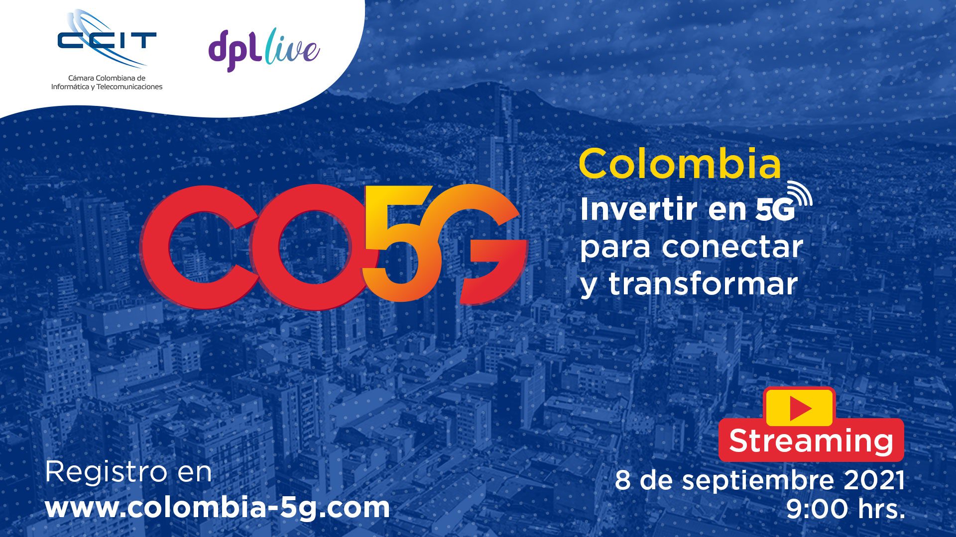 La Cámara Colombiana de Informática y Telecomunicaciones (CCIT) y DPL Live le hacemos una cordial invitación a asistir al evento virtual Colombia 5G, donde compartirá el espacio con destacadas y destacados pensadores del sector TIC y digital en Colombia y América Latina. La cita es el miércoles 8 de septiembre de 2021.