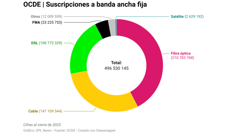 Más y más fibra óptica. El bloque OCDE terminó 2023 con 496.5 millones de suscripciones a banda ancha fija y 42.4 por ciento de ellas corresponden a fibra óptica. El resto se divide entre accesos por cable (29.6%), DSL (20.3%), FWA (4.7%), satélite (0.5%) y otros. El crecimiento de fibra no se detiene: el total de conexiones de este tipo creció 22.4 por ciento entre 2019 y 2021, y 23.5 por ciento entre ese año y 2023.