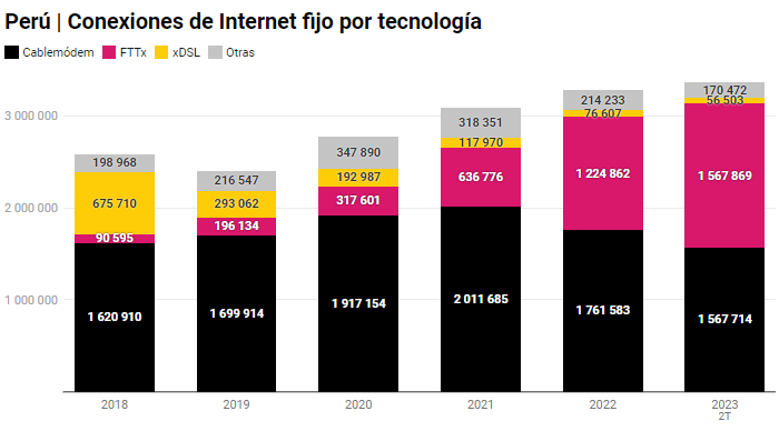 La fibra óptica es la forma más habitual de acceso a Internet fijo en Perú. La tecnología incrementó su base un 76 por ciento interanual en el registro de junio de 2023 y se posicionó por encima del resto por primera vez en los registros del Organismo Supervisor de la Inversión Privada en Telecomunicaciones (Osiptel). Ahora, con 1.56 millones de abonados, representa 46.6 por ciento de la base.