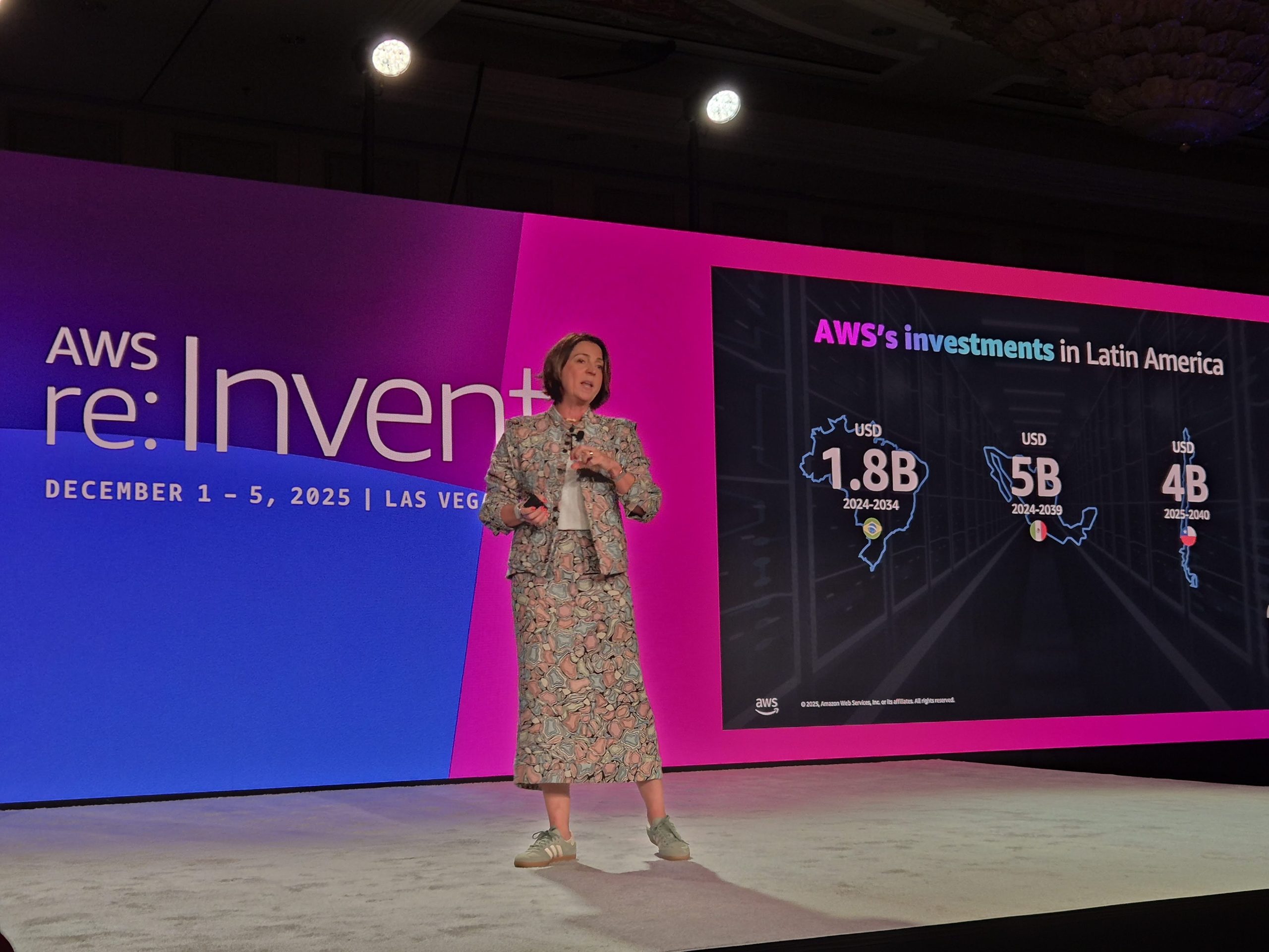 Las Vegas, Nevada. Paula Bellizia, vicepresidenta para América Latina de Amazon Web Services (AWS), calificó a la Inteligencia Artificial Agéntica como la “nueva frontera” y una nueva oportunidad para la región de trabajar en los desafíos locales a través de la innovación. Para aprovechar esta oportunidad es que la compañía ha acelerado sus inversiones en la región, incluyendo los 5,000 millones de dólares para el despliegue de una región en México y el próximo lanzamiento de una nueva región en Chile en 2026.