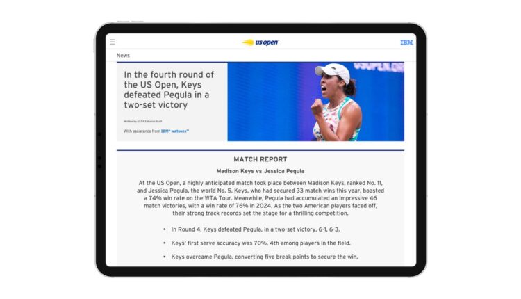 IBM y la Asociación de Tenis de Estados Unidos (USTA) presentaron soluciones impulsadas por Inteligencia Artificial (IA) para el evento deportivo US Open, en donde la empresa tecnológica entregará resúmenes generados por IA de cada partido individual masculino y femeninil a los pocos minutos de su finalización.