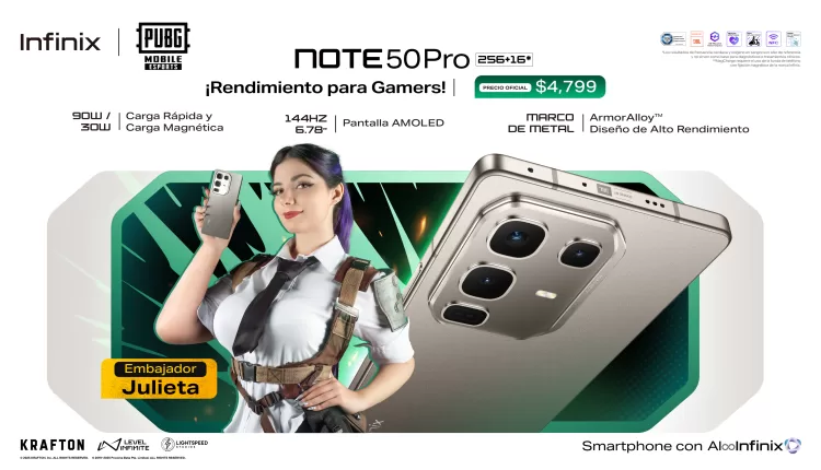 Infinix, la marca de smartphones enfocada en gaming, presenta oficialmente en México el NOTE 50 Pro y el NOTE 50 X, dos dispositivos que elevan el estándar de su categoría al combinar diseño premium, carga ultrarrápida de última generación y una experiencia inmersiva optimizada para videojuegos, en colaboración con PUBG MOBILE. Pensados para quienes buscan rendimiento, funcionalidad y estilo, estos nuevos modelos redefinen la forma en que los usuarios disfrutan del gaming, la productividad y el entretenimiento móvil. El NOTE 50 Pro llega a México con un precio de $4,799 MXN en colores Gris, Negro y Púrpura y el NOTE 50 X está en $3,499 MXN en colores Gris, Púrpura y verde, disponibles en Mercado Libre y la TikTok Shop de Infinix México.
