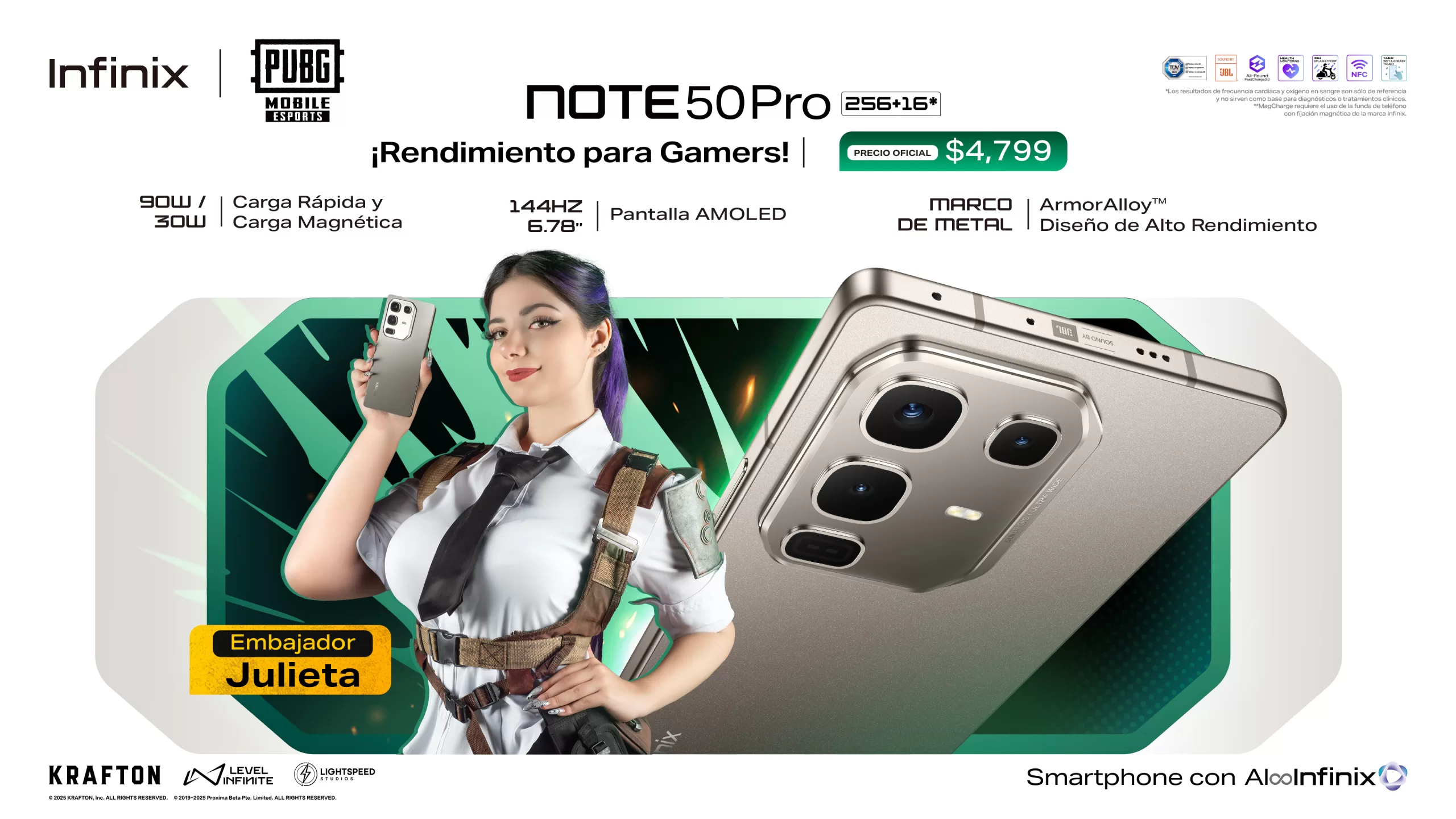 El Note 50 X, destaca principalmente porque diseñados para una experiencia gaming optimizada en colaboración con PUBG MOBILE. Además de un uso duradero. Cuenta con la tecnología All-Round FastCharge 3.0, ofreciendo una carga rápida 45W, batería de 5200mAh, y durabilidad certificada con el estándar militar MIL-810H, lo que lo hace increíblemente resistente. Su potencia proviene del MediaTek Dimensity 7300 Ultimate 5G Chipset, asegurando un rendimiento fluido en juego constante, además de contar con su edición especial de PUBG MOBILE.