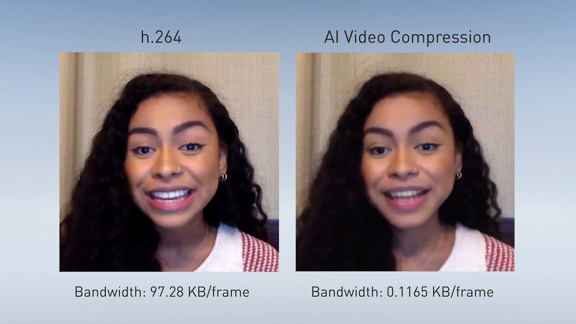Por medio de IA, el software analiza los puntos faciales clave de las personas y realiza una animación inteligente del rostro que deriva en menos datos. En una comparativa con un video H.264 que ocupa 97.28 KB por cuadro, la compresión inteligente de Maxine consigue bajar la cuota hasta 0.11 KB por cuadro.