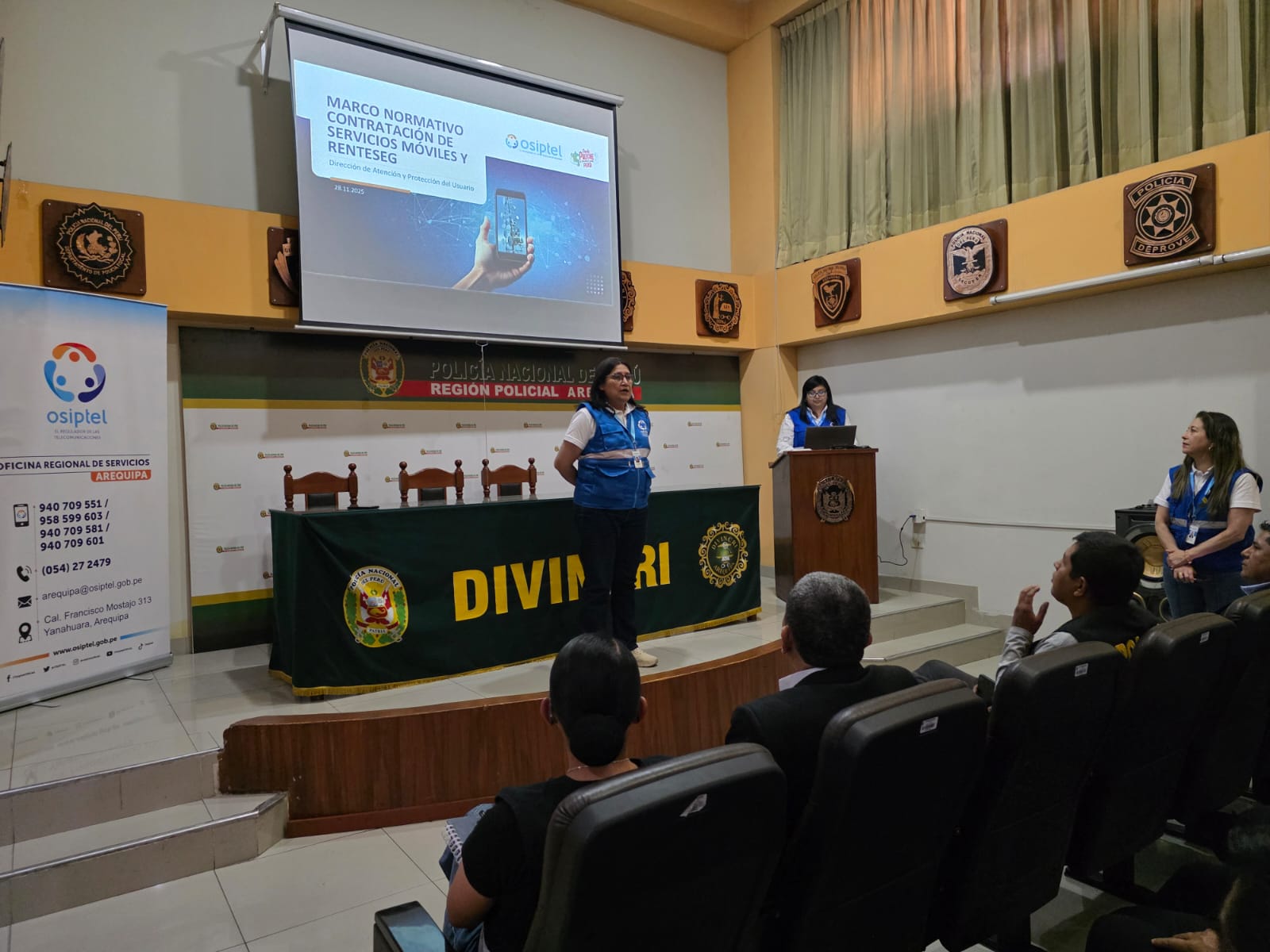 En ese marco, OSIPTEL realizó un taller informativo dirigido al personal de la División de Investigación Criminal (Divincri) de la PNP de Arequipa, con el propósito de profundizar sus conocimientos sobre el Renteseg y en particular, sobre el uso del Módulo de Consulta Especializado para Entidades del Estado. En las actividades participaron Tatiana Piccini Antón, directora de Atención y Protección al Usuario del OSIPTEL, y Dario Obando Borja, jefe de la oficina regional del regulador en Arequipa.