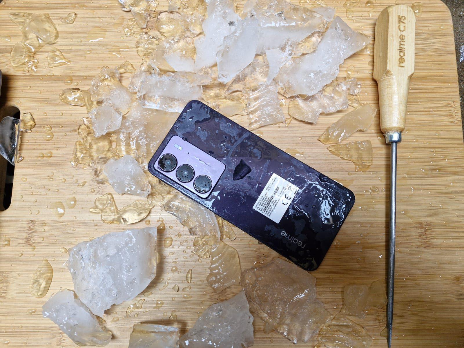 Una de las cualidades más impactantes del realme C75 es su resistencia a temperaturas extremas. Lo introduje en un recipiente con agua y lo congelé durante dos días completos, como si se tratara de una paleta.