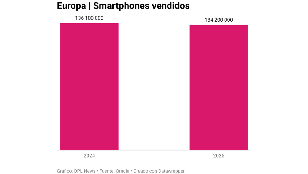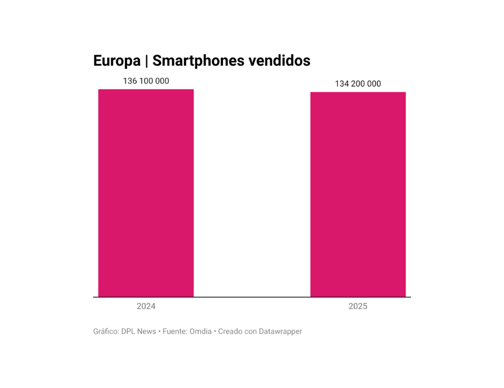 Según el reporte, Europa representó sólo el 10.8% de los smartphones vendidos en el mundo el año pasado y preocupa a los fabricantes posibles afectaciones por aumento de precios o escasez de suministro de cara a los resultados para 2026.