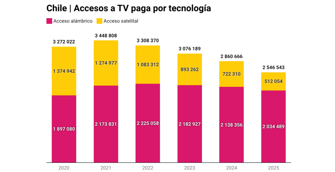 Se mantiene la tendencia a la baja de los suscriptores de televisión paga en Chile. La Subsecretaría de Telecomunicaciones (Subtel) registró 2.5 millones de accesos a 2025, cifra 11.2% más baja que un año atrás. En los últimos 12 meses la base se redujo en más de 314,000 abonados. Ocho de cada 10 abonados accede mediante tecnologías alámbricas.
