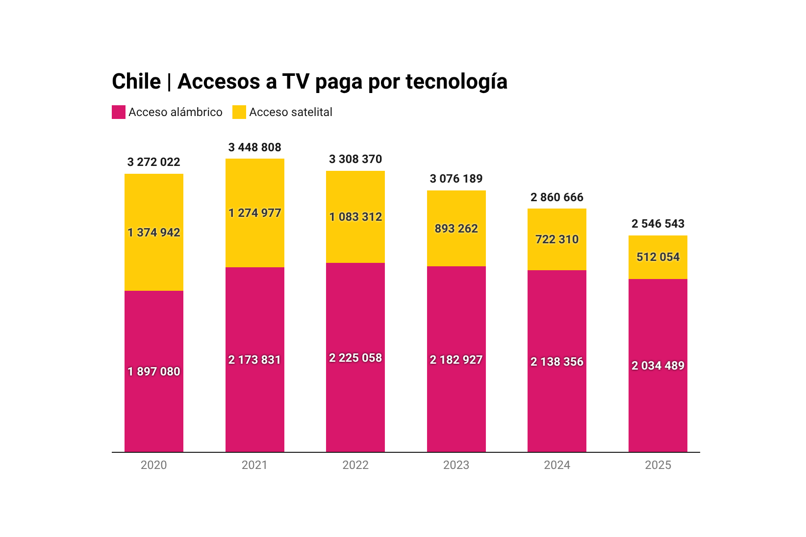 Se mantiene la tendencia a la baja de los suscriptores de televisión paga en Chile. La Subsecretaría de Telecomunicaciones (Subtel) registró 2.5 millones de accesos a 2025, cifra 11.2% más baja que un año atrás. En los últimos 12 meses la base se redujo en más de 314,000 abonados. Ocho de cada 10 abonados accede mediante tecnologías alámbricas.