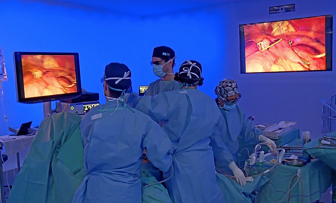 De Lacy, director del servicio de cirugía gastrointestinal del hospital, utilizó su dedo para marcar en la pantalla una zona del intestino donde se encuentran los nervios e pidió al equipo mucha precaución para no cortarla.