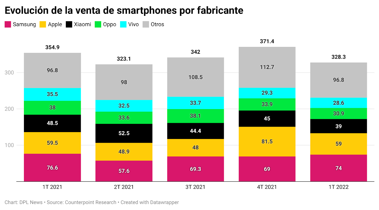 Se comercializaron 328.3 millones de smartphones en el primer trimestre de 2022, cifra 7 por ciento y 12 por ciento inferior en la comparación anual y trimestral, respectivamente. Entre las causas de la caída, el análisis de Counterpoint Research marcó la escasez continua de componentes, el rebrote de la Covid-19 a principios del periodo y la guerra entre Rusia y Ucrania al final.